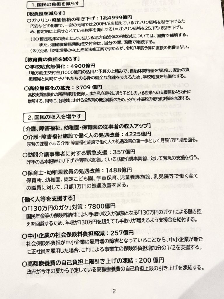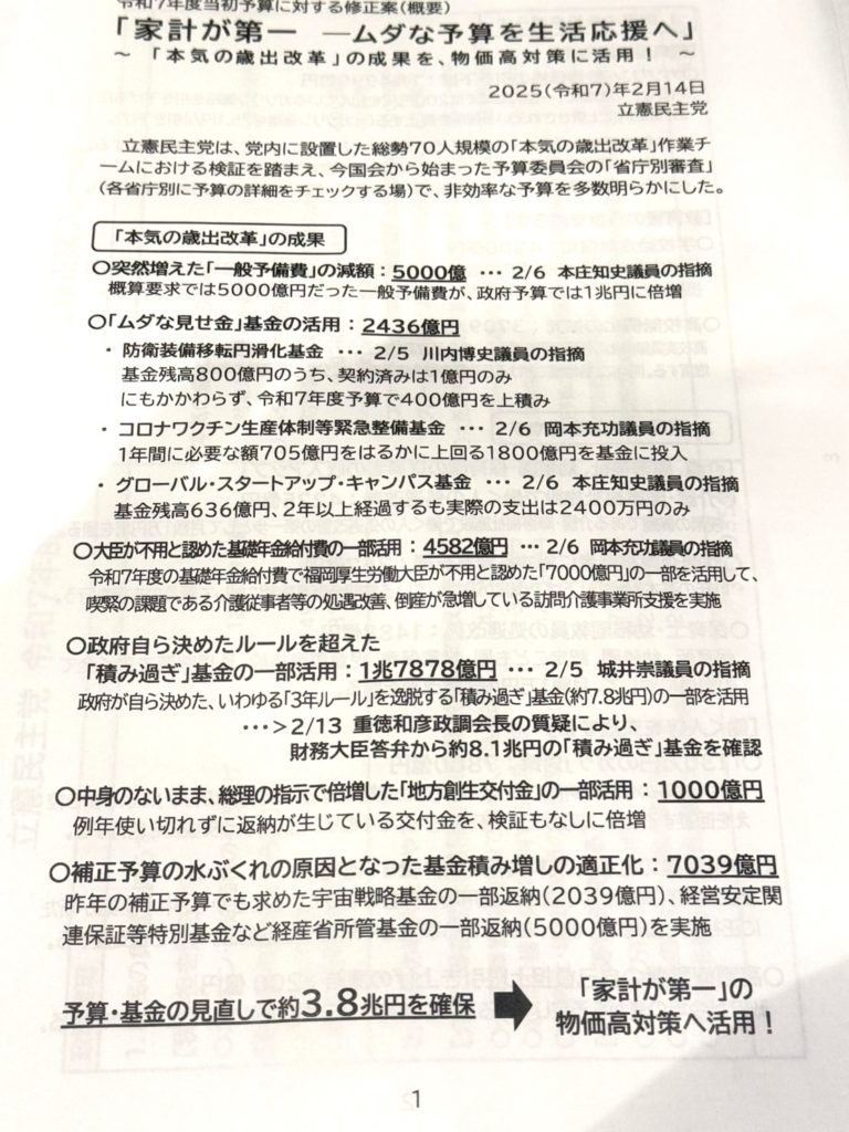 ホーム代議士会と本会議議事です 代議士会と本会議議事です活動報告 代議士会では、僕らの予算の審査の結果、多々、各省庁の歳出改革すべきものが見つかり、その無駄をなくし、その部分をガソリン税の引き下げ、給食無償化、介護士や保育園の従事者の収入アップに使うべきとの予算修正案の報告がありました。本会議では、国家公務員の任命についての人事が採決され、その後、加藤財務大臣から所得税法改正案の趣旨説明があり与野党の質疑が行われました。