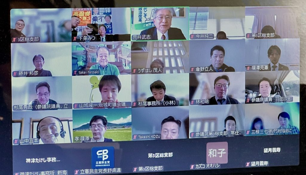 ホーム立憲民主党長野県連第33回常任幹事会(webでの開催)です 立憲民主党長野県連第33回常任幹事会(webでの開催)です活動報告 議題は県連幹事長の羽田次郎議員が今年選挙の為、幹事長職を辞任して、荒井武志県議が選任、参議院選挙の活動方針、県連定期大会などが上がり、それぞれ承認されました。 また来週、野田代表が来県される対話集会についても報告されました。いよいよ、国会活動も予算と共に本格化しますが、並行して地元の県連の各総支部の引き締めが大事になってきてます。しっかりと頑張ります❗️