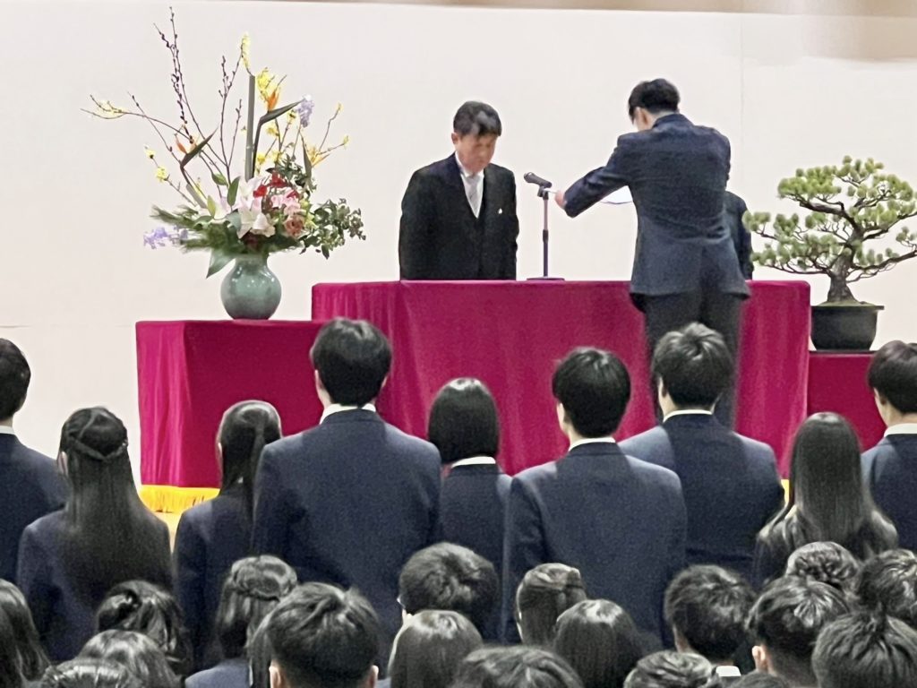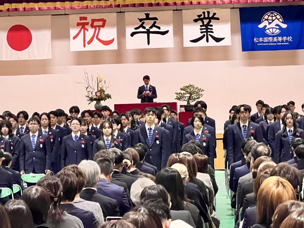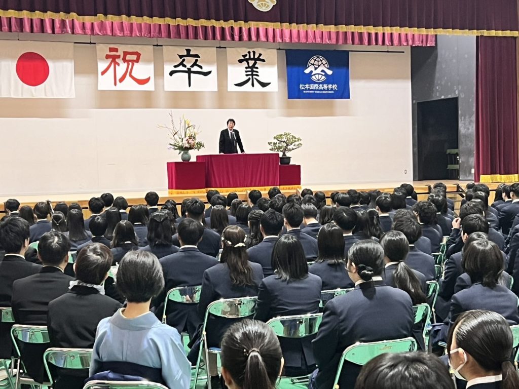 ホーム松本国際高校令和6年度卒業証書授与式です 松本国際高校令和6年度卒業証書授与式です活動報告 はじめに恒例の拍手で卒業生をお迎えして、それぞれのクラスの代表の方に鈴木校長先生より卒業証書や各賞状の授与が行われました。その後、校長先生より温かい送る言葉があり、僕からも「堂々とした生徒さん達であり、素晴らしいです。どうか学校で培ったものをそれぞれの道で活かして頑張ってください。」とご挨拶させて頂きました。最後に野球部の木村君より先生や家族、友人への心のこもった感謝の言葉があり、閉式しました。温かな式でした、皆様、誠におめでとうございました❗️