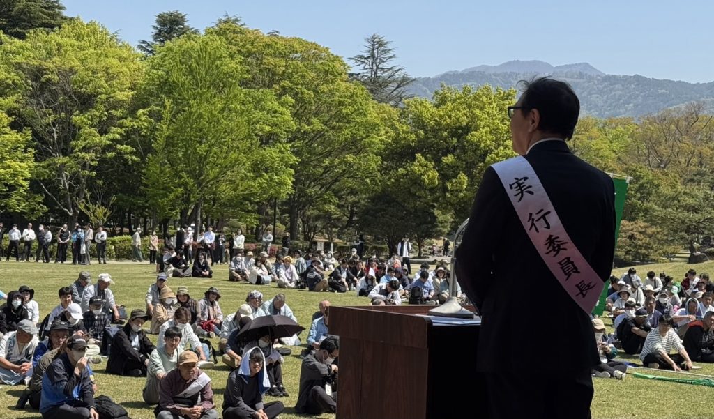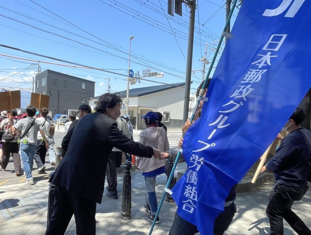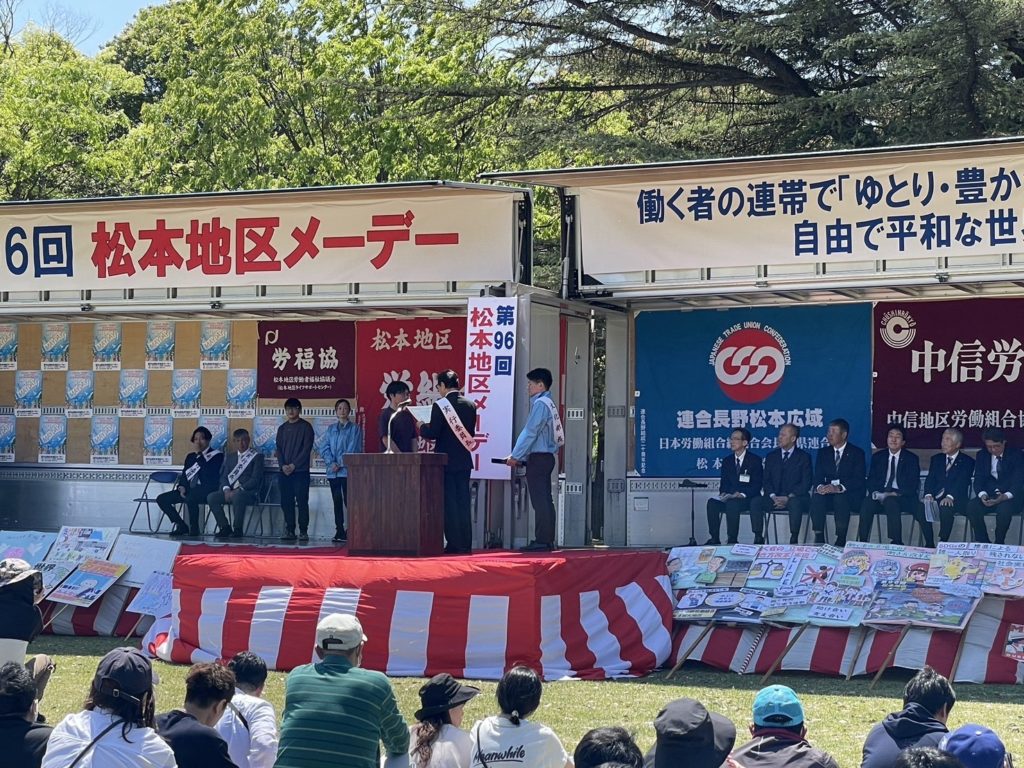 その後、メーデー宣言の採択、プラカードコンクールの表彰があり、最後に全員で「頑張ろう」三唱が行われ、いよいよデモ行進となりました。