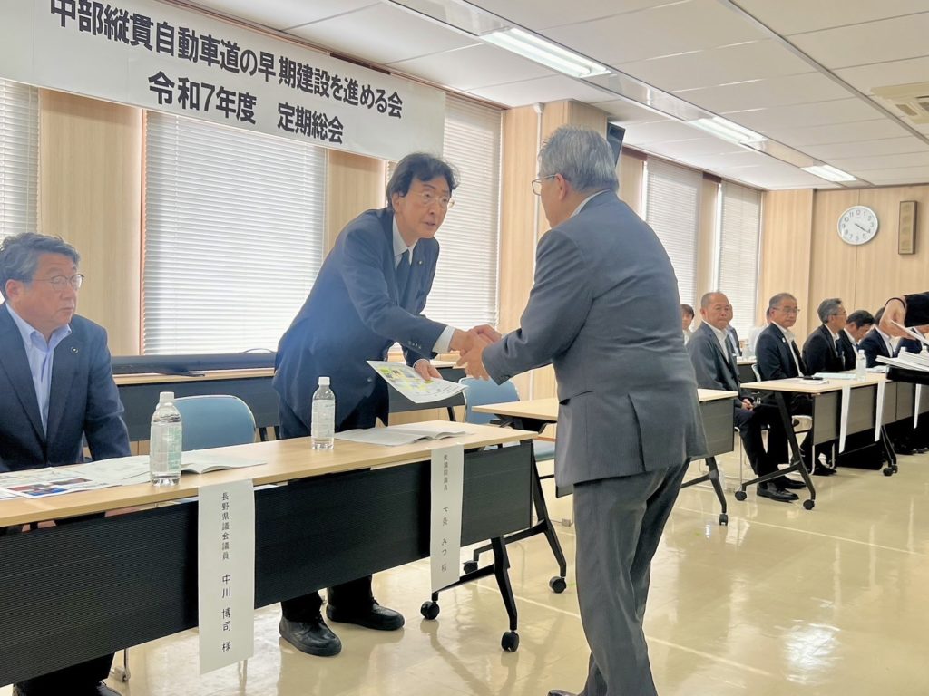 ホーム中部縦貫自動車道の早期建設を求める会令和7年度定期総会です 中部縦貫自動車道の早期建設を求める会令和7年度定期総会です活動報告 はじめに急逝された赤羽会頭の後任の斉藤茂行会頭代行より、これまでのご協力への感謝とこれからの課題などのお話しがありました。僕からは道路は人間で言えば血管にあたり、途中で止まっては効果が半減であり、通勤・通学、観光、災害、緊急時の正に地域の生命線です。これからも引き続き、政府・行政へ更にスピードアップして本日のご要請の内容を繋いで参ります、とご挨拶させて頂きました。皆様の熱い思いがひしひしと伝わってくる素晴らしい集会でした。本日は誠におめでとうございました。ご一緒に頑張りましょう!
