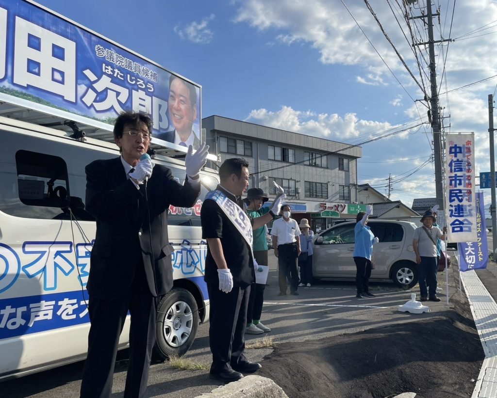 ホーム松本市新村交差点街頭演説です 松本市新村交差点街頭演説です活動報告 こちらもまだまだ暑い中、多くの友党の皆様をはじめお集まり頂きました。 羽田候補からも、ガソリン税や政治への信頼回復などを選択する大事な参議院選挙であり、何としても皆様のお力をとの強い訴えをさせて頂きました。 お集まり、ありがとうございました。