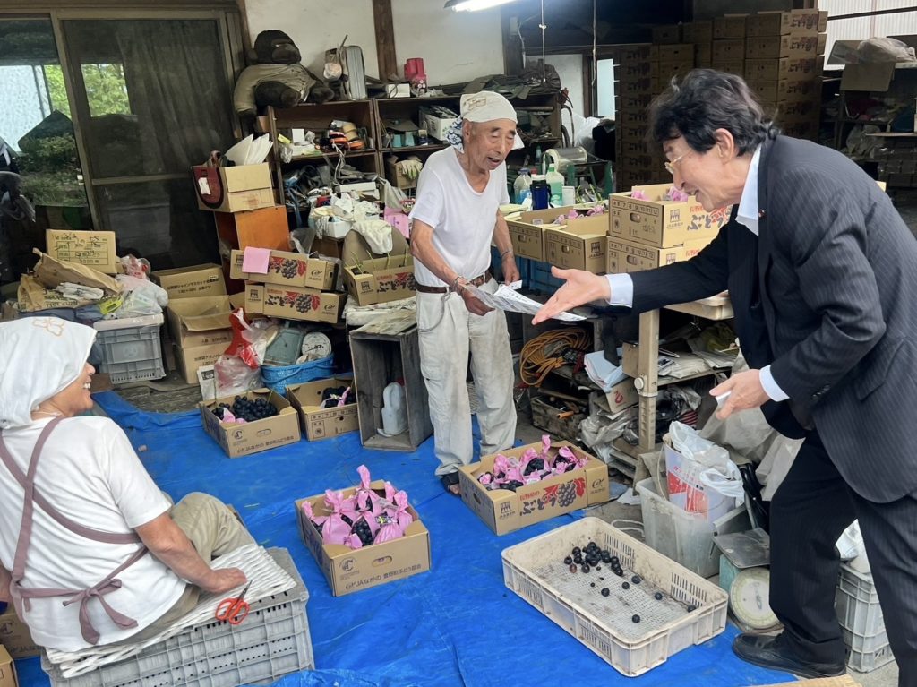 ホーム「農業を頼みます!」 「農業を頼みます!」活動報告 北信地区の後援会のお宅です。家族でぶどうなどを中心で作られてます。「ともかく暑さもあり、また担い手もやらんので、わしらだけだわ。今のままだとわしらの代で終わりかもしれん。もっと政治で応援して欲しい。みつさん、期待しているよ!」との事でした。 品種改良への助成や所得補償など、食料の安全保障としても、また何としても国内農業を守る為にも、これからも政府に強く要請して参りますと、お話しさせて頂きました。これこそ正に現場の声です。農業は、国、そして長野県の礎です。しっかりと対応致します!