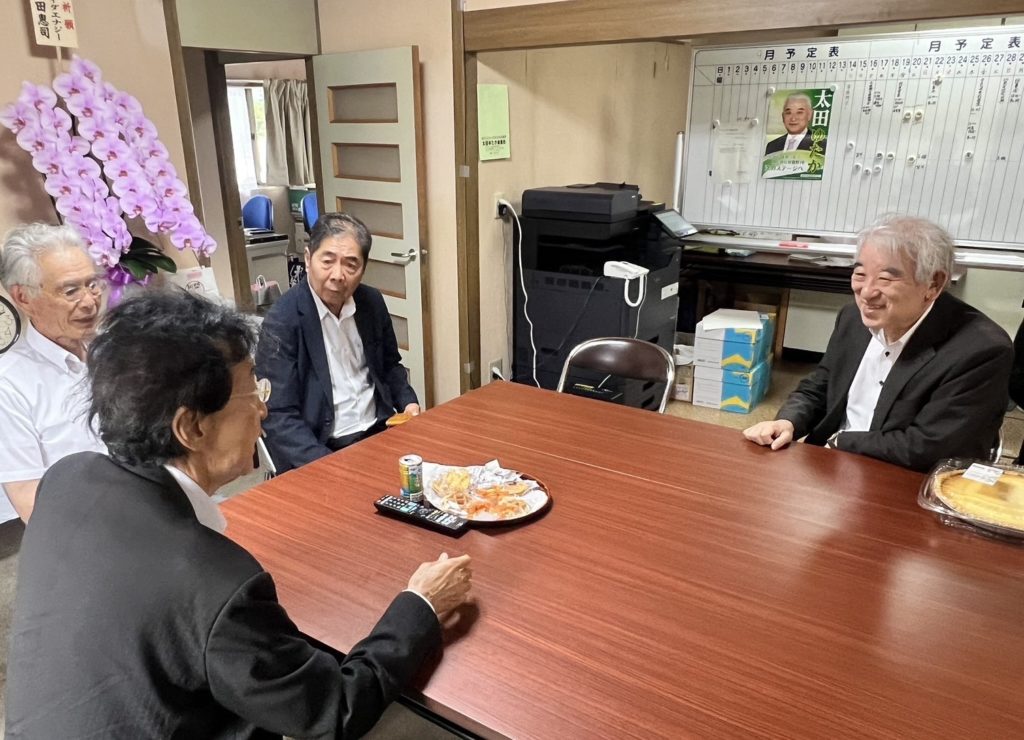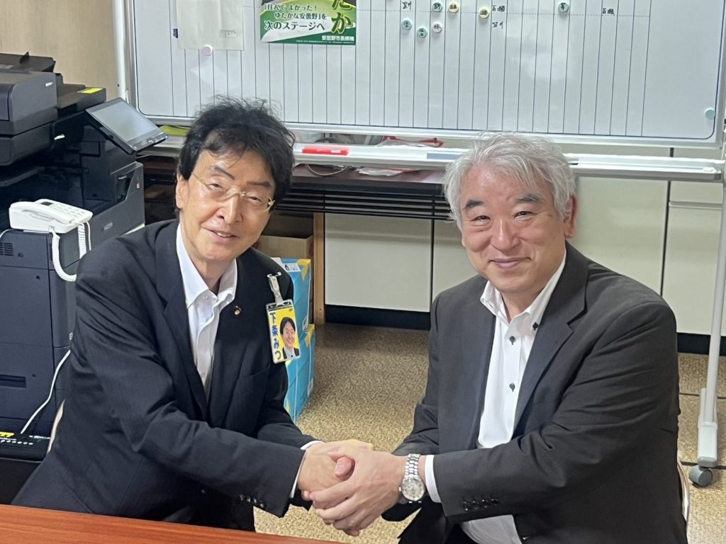 ホーム安曇野市長への激励です 安曇野市長への激励です活動報告 来月の市長選に出馬予定の現職の太田市長の事務所にお伺いしました。丁度役員の方々の打ち合わせの最中でしたが、色々意見交換をさせて頂きました。また昨日が誕生日で、元気いっぱいでおられ、誠におめでとうございました。市長とは長いお付き合いですし、その実績、お人柄、人脈など素晴らしいにつきます。僕らの後援会も全面的に応援しております。どうか身体に気をつけられ頑張ってください❗️
