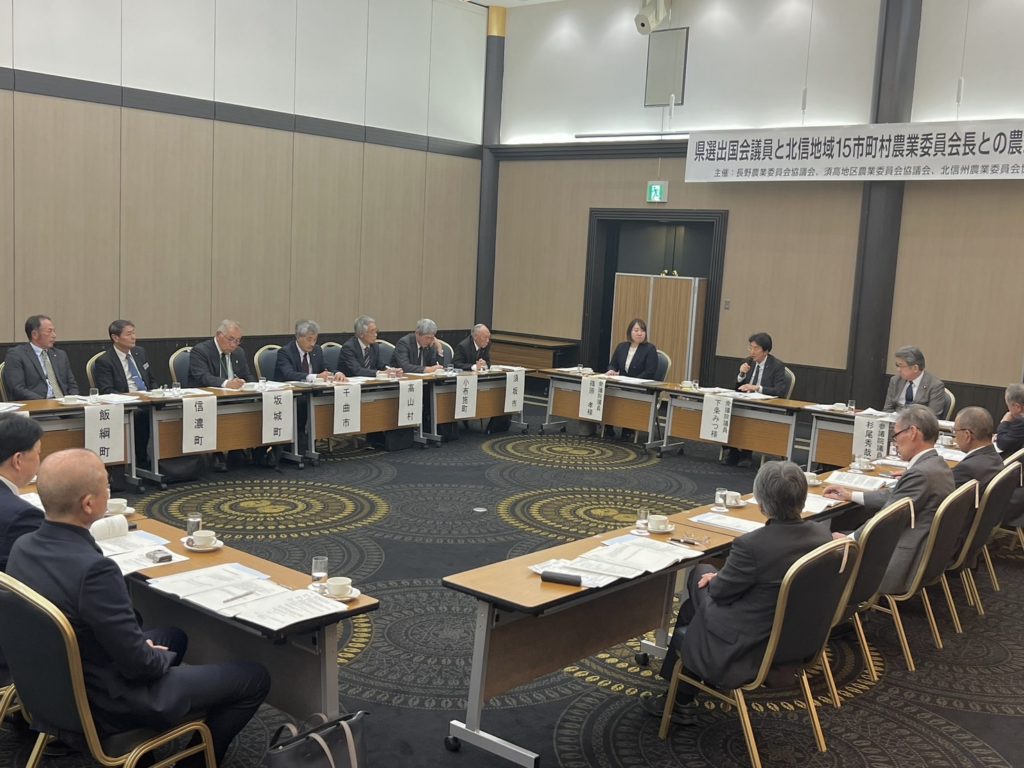 恒例の会です、お招き頂きお伺いしました。はじめに青木保会長より農業の苦しい現状や今後の課題についてお話しがありました。その後、各地区の会長より、就農支援、担い手不足、農村振興施策、鳥獣害対策、農地調整など多岐に亘るご要請がありました。僕からは就農支援については対象年齢を現状に合わせて65歳まであげるべきこと、一方親元について要件の見直しを行われており支援対象が広がったこと、地域計画は農地の大区画により基盤整備の推進をしていること、米価格も食料システム法により生産者のコスト等をしっかりと消費者などに分かりやすく伝えて生産・消費者双方を守ること、また、クマ対策については、僕らの強い要請に寄って、この11月より国家公安委員会規則改正があり長野県も警察でライフルを4丁配備が通り、専用駆除部隊の設置も検討中などのお話しをさせて頂きました。農業は正に長野県の礎です。食料安全保障の面に照らしても、皆様のご要請、今後ともしっかりと政府に繋いで参ります。本日は、大変良いご提言ありがとうございました。