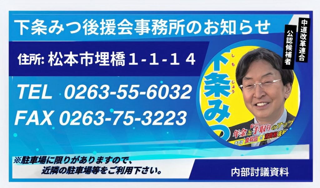 ホーム下条みつ後援会事務所のお知らせです 下条みつ後援会事務所のお知らせですお知らせ 下条みつ後援会事務所を開設しております。後援会事務所は、毎日朝8時より開所しております。お気軽にお立ち寄りください。