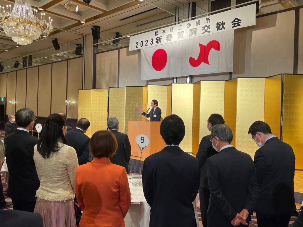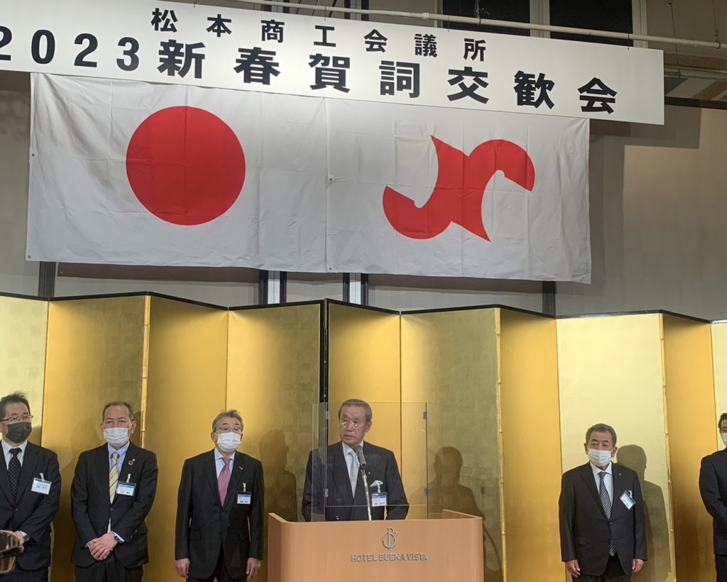 最初に、赤羽新会頭と役員の皆様が壇上に勢揃いして、1年の前向きな抱負の披露がありました。