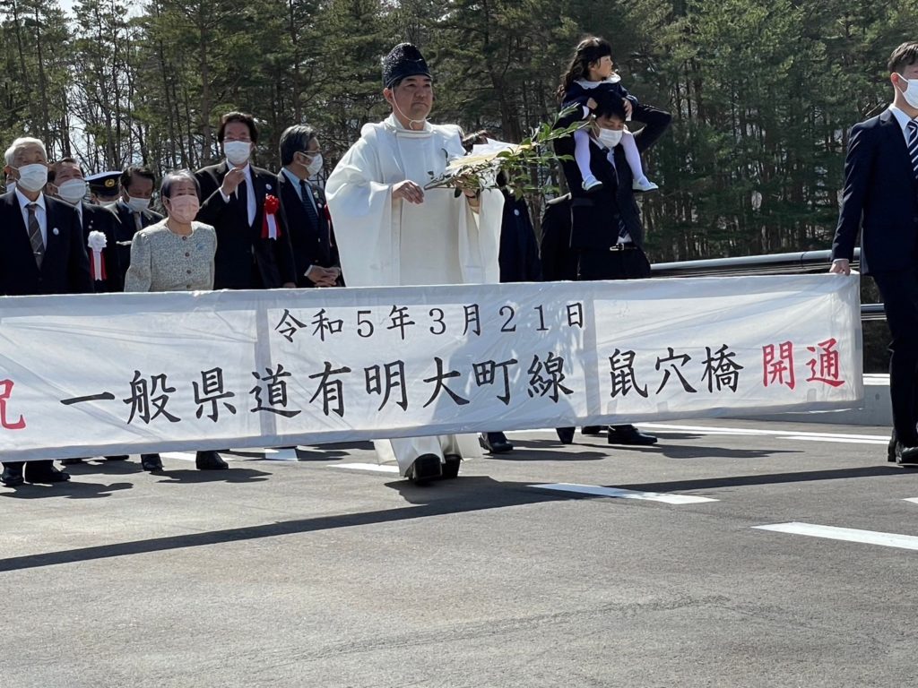待ちに待った開通です。天気も良く最高の式典になりました。連絡協議会の牛越大町市長などのご挨拶の後、僕からは、山麓線の鼠穴橋近辺は、カーブがひどくとても危険で、関係する方々の長年の願いが叶い、開通となりました、とお話しさせて頂きました。