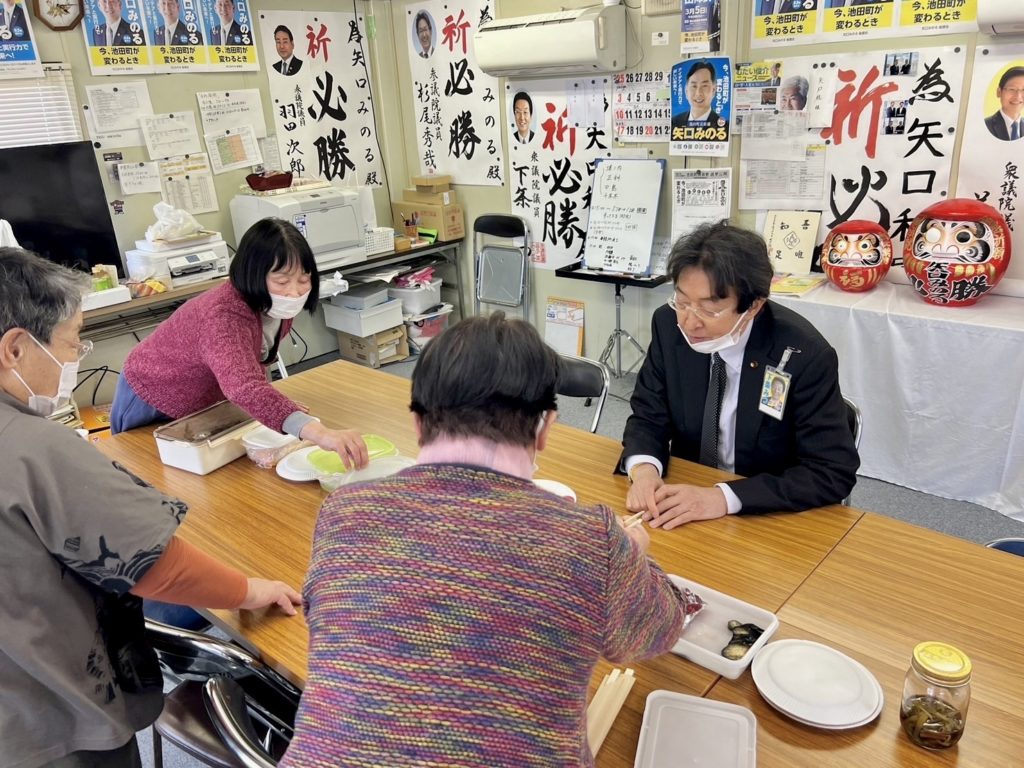 ホーム池田町町長選の矢口みのる候補の選挙事務所です 池田町町長選の矢口みのる候補の選挙事務所です活動報告 明日、投開票になるため、激励にお伺いしました。色んな差し入れも頂き、家族的で温かい事務所ですね。 あと数時間です、激戦ですが頑張りましょう‼️