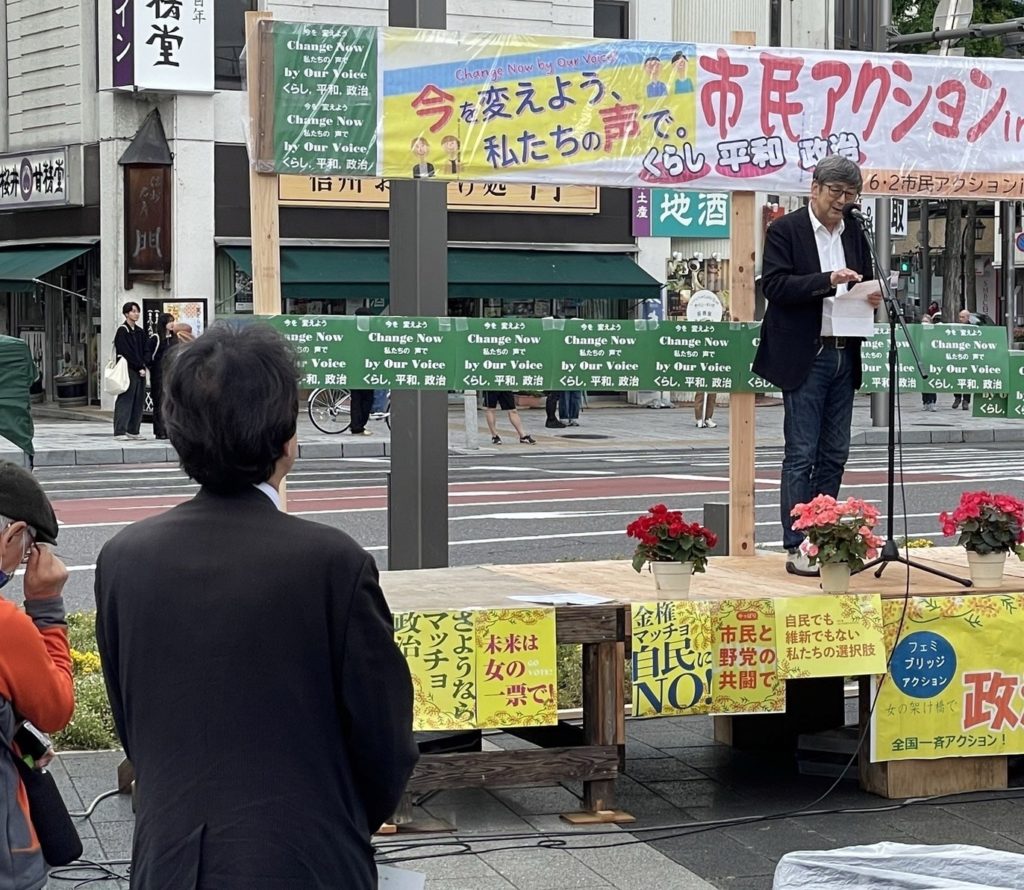 はじめに、ノリの良いジャズの演奏のあと、又坂代表より、市民運動により今の腐った自民政治を変えようとの力強いお話があり、その後、立憲、共産、社民からのご挨拶がありました。