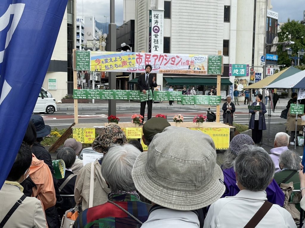 また、市民運動家、医労連、上田の会などのアピールの後、小雨になりましたが、市内を元気よく行進致しました。