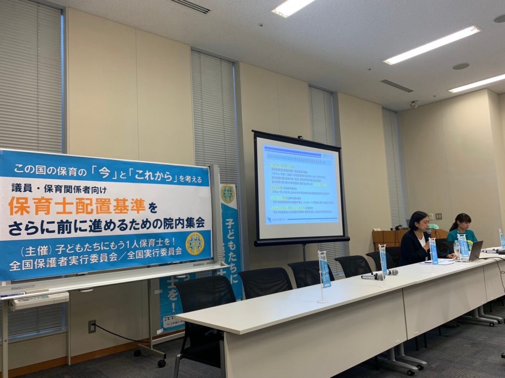 3年前のコロナ禍で保護者と保育士で作られた会の院内集会が開催され、日本総研の池本美香さんから保育施策の在り方についてお話を伺いました。