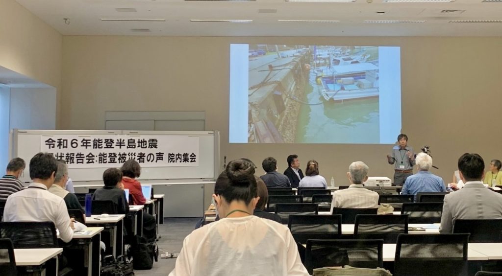 主催者代表の菅由美子様からはがれきは未だそのままで、ボランティア方々はがほとんど来れず、まだ支援が必要だという現状を知っていただきたい。珠洲市の住職の塚本様からは「海底が2M隆起し、船が海底とくっついて船が出せずに漁師の皆様が苦しんでいので、国で早く海底を掘って欲しい」能登町の町議の方からは「公費解体が全く進んでない。また、あらゆる業者が不足し、資材単価が高騰し県補助だけでは自己負担が大きい。未だ上水道が使えず、ブルーシートも劣化し雨漏りがし、人口流出の要因になっている、況で国の後押しで何とかしてほしい」七尾市の病院の理事長からは、2007年の地震や東日本大震災の知見で、井戸水を使えるようにし、業務用のiphoneを準備していた結果、1月2日に女児出産、4日には外来をフルオープンさせ、人工透析も6日から稼働し、平時からの準備の大切さなどをお話いただきました。まだまだのことも多いです、スピードを上げるよう、中央に要請して参ります。