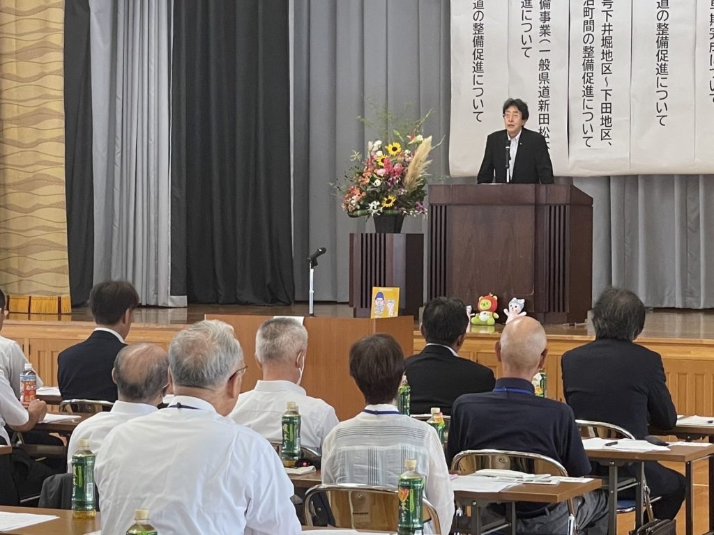鎌田会長のご挨拶のあと、僕からも、少子高齢化を救う一つの手立てが道路整備です。通勤・通学・緊急搬送などに対応がよりできれば、若い人たちが地域に残りやすくなり、また、世帯を持ち易くなります。与野党超えてしっかりとサポートしますと、お話しさせて頂きました。