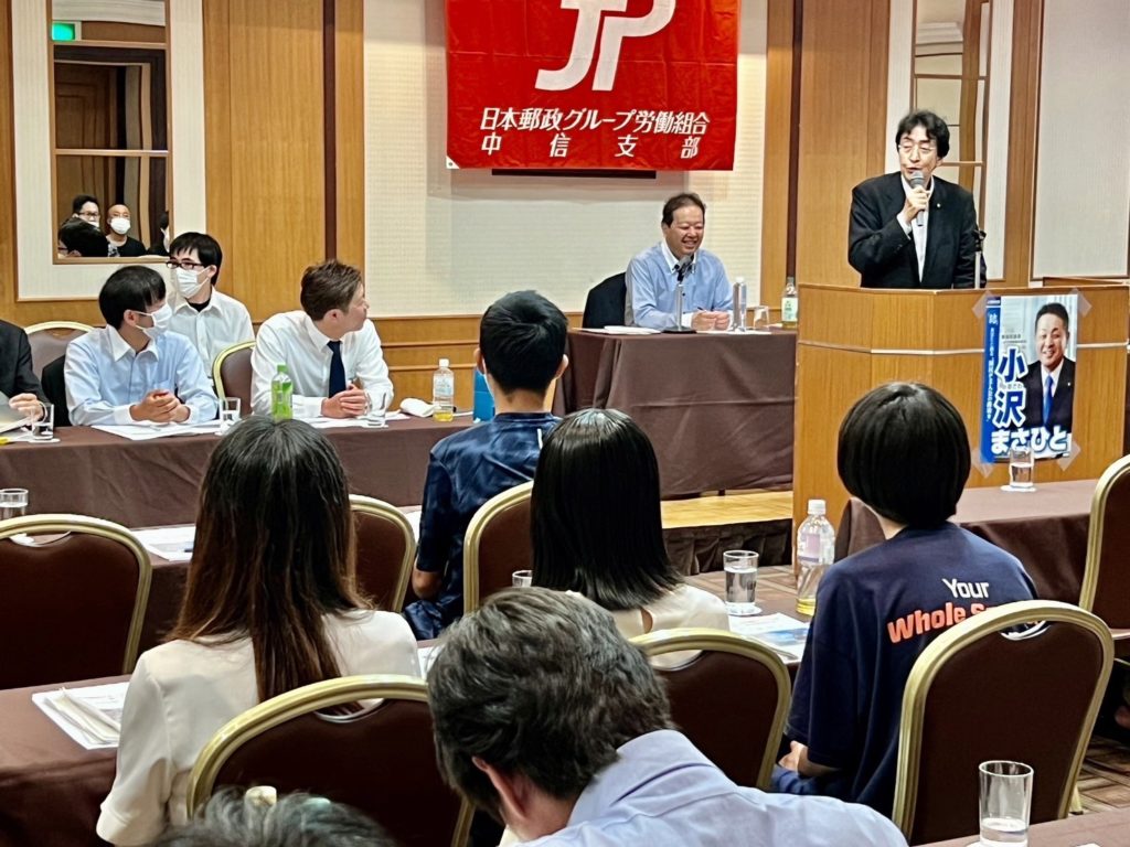 ホームJP労組中信支部大会です JP労組中信支部大会です活動報告 鈴木委員長の行き届いたご挨拶のあと、僕から日頃の立憲へのご協力に感謝を申し上げ、国政、代表選、自民の総裁選などのお話しをさせてました。また来年度改選になる小沢参議院議員への更なる支持の拡大をお願い致しました。 本日の素晴らしい大会、誠におめでとうございました!今後とも宜しくお願い致します🤲
