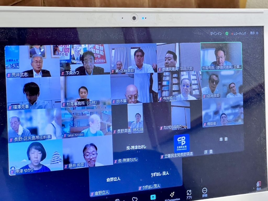 ホーム立憲民主党長野県連常任幹事会です 立憲民主党長野県連常任幹事会です活動報告 本日は、WEBにてそれぞれ参加となりました。議題は代表選、来る総選挙体制、参議院選挙の公認、自治体議員フォーラムなど多岐に渡り、熱のこもった議論が行われ、あっという間に時間が経ちました。 本日の皆様の貴重な意見を踏まえ、県連としてもしっかりと対応してまいります。本日は大変お疲れ様でした。